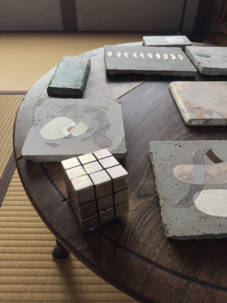 立体である、箔を全面に貼ったルービックキューブがその認識を強調する。