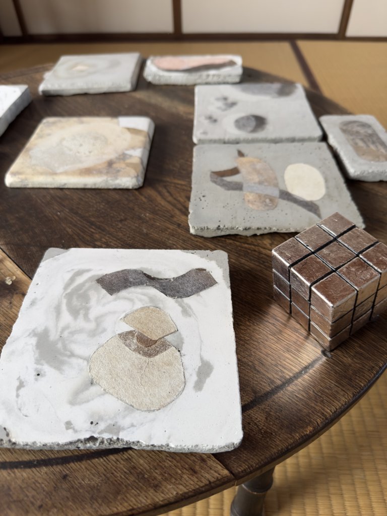 土台となっているのは日本古来のちゃぶ台で、床に座って囲む食事用のテーブルである。作品は食卓のように中央に向かって四方に天地が別々に配され、鑑賞者はちゃぶ台の回りを回りながら作品を鑑賞する事により、角度によってその表情を変えるうる箔の特性を発見する。